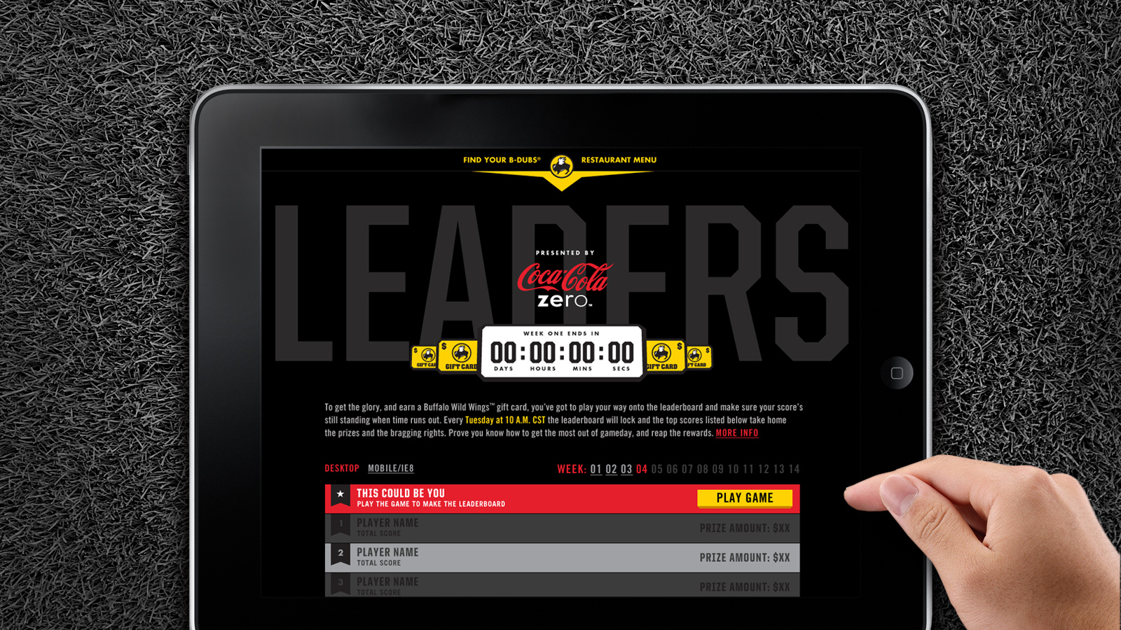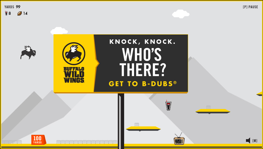 Watching football at home is an intruiging proposition, but its also surrounded by distraction and obligations to do things other than football. aTo reveal this truth to our fans we created a fun, retro-inspired video game where the whole point was to avoid the distractions found at home and get to B-Dubs...you know, the exact behavior we wanted them to take IRL. To top it off, we rewarded the highest performers in the game with drinks, wings and other prizes redeemable in restaurant.